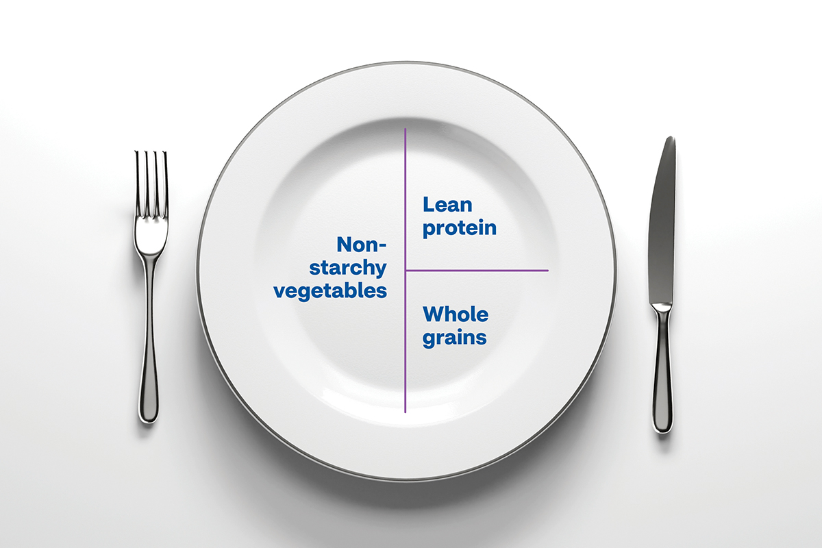 This approach to filling your plate is a simple and effective way to build balanced meals. You can use it throughout the day to help control your blood sugar and manage your condition.